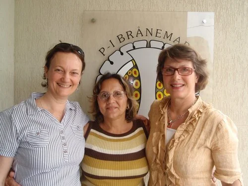 Anne-Marie and Dr Kerstin Bergström on either side of a Brazilian patient wearing the orbital prosthesis she has just received in front of the Branemark Foundation, in Bauru, Sao Paulo, Brazil