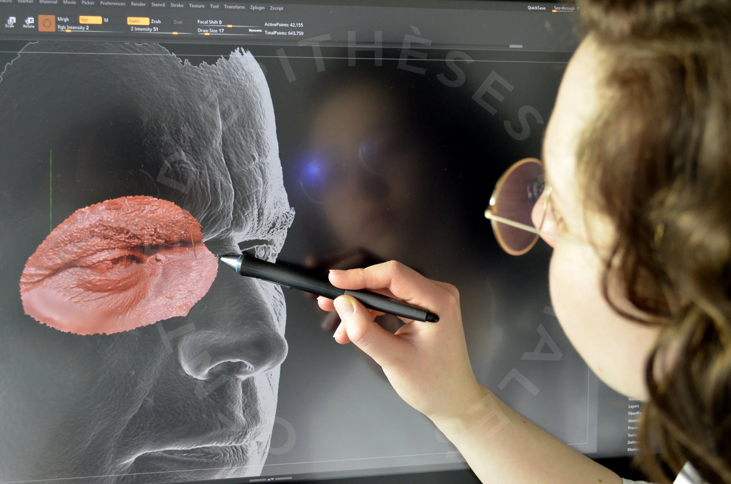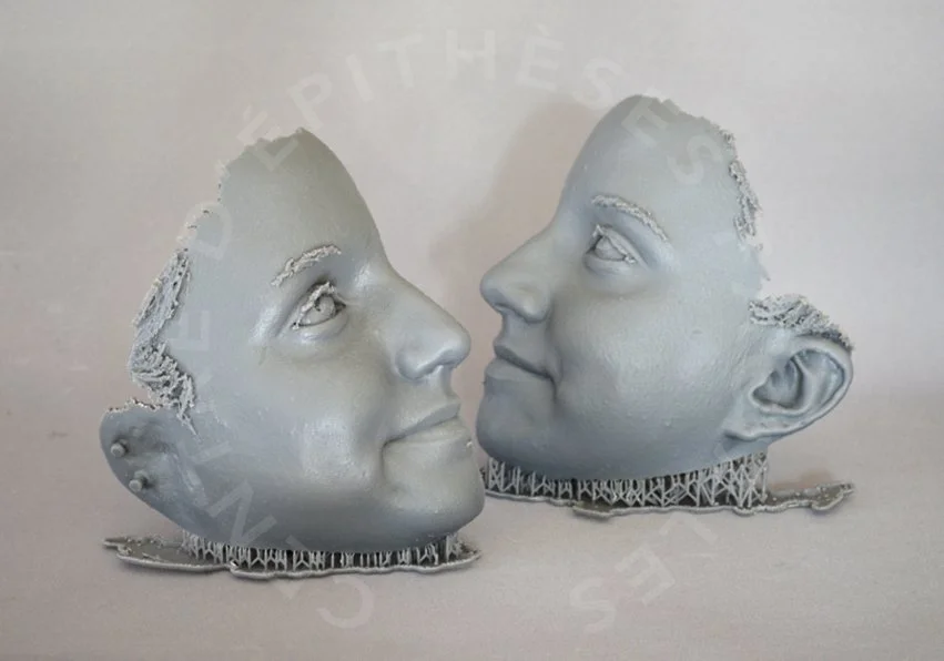 The model of the prosthesis is then printed out in resin with a 3-D printer. The patient’s face, which will act as a model to position the prosthesis, is also printed out in resin.